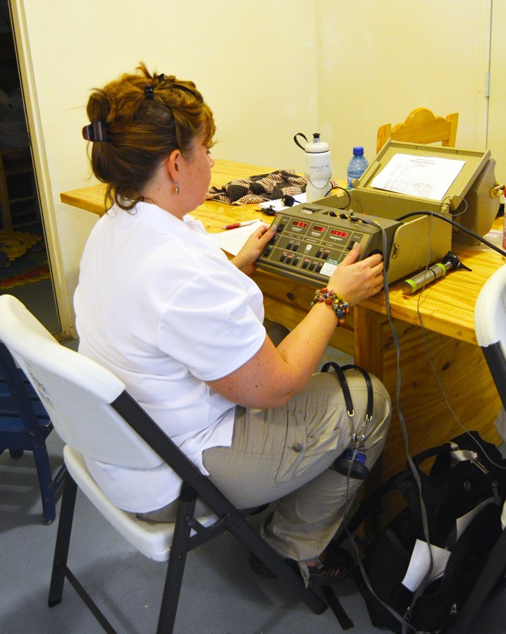 At the school, we set up stations with otoscopy (instruments to see inside of the ear), tympanometry and acoustic reflexes (to determine how the eardrum is functioning), otoacoustic emissions (testing the cellular function of the inner ear), conditioned play screening, diagnostic air/bone/live speech and even ABRs (to tests the amount of hearing). We also took Impressions for ear molds for children who will be fit with hearing aids. In addition to identifying those children with hearing loss, we successfully ruled out hearing loss as a cause of language or developmental delay in many children of concern.